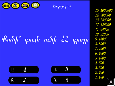 Ձեզ եմ ներկայացնում "Ով է ուզում դառնալ միլիոնատեր" խաղը հայերեն լեզվով: Այն առաջին խաղերից է, որը գրվել է իմ կողմից հայերեն լեզվով 2003թ.: Այս խաղը կարելի է հանդիպել Հայաստանում գտնվող 10 համակարգիչներից 7-ի մեջ: Մի քիչ գլուխ եմ գովում, բայց տեղ ունեմ :)